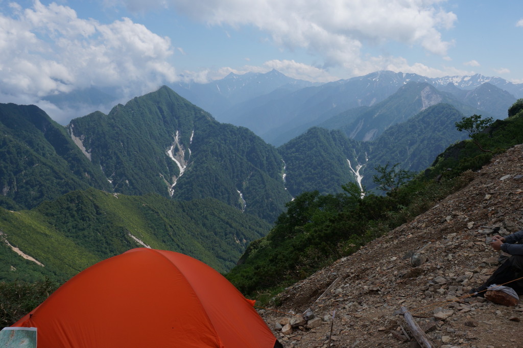 テン場は既に満杯で、写真の通り雪渓の上を整地して張りました。そのおかげか、涼しいどころか寒くて寒くて…。担いできたビールを一缶持ち帰る羽目になろうとは。