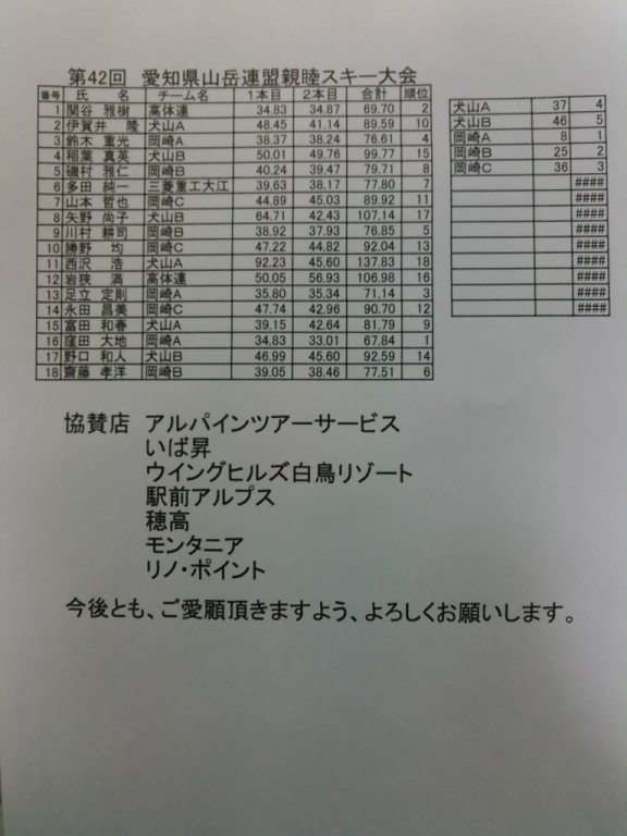 岳連スキー大会 投稿者: kubota2016/02/212020/05/07活動報告 ◆山行概要 獲りやした!岡崎Aチーム優勝です! そして、Bチームが2位、Cチームが3位。 個人も、1位、3位、4位、5位と4人が入賞し、OAC大活躍でした! ◆特記事項(会員限定) ↓↓↓結果はこちら↓↓↓