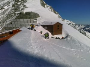 夏道沿いに下り、穂高岳山荘前で休憩。風がなく、日射しもあって暖かい。他のパーティもここで休憩し、奥穂に登る準備をしている。