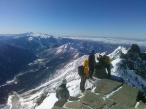 鉄の梯子を登り、たぶん夏道通りに登って奥穂山頂に到着。狭い山頂で登頂を喜びあう。どちらを見てもすばらしい展望。北には槍が、東には笠が、見下ろせば大正池がくっきり見える。風がないので山頂でも寒さは感じない。
