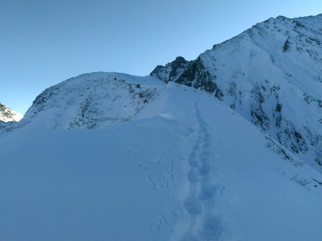 そのまま樹林帯を抜け稜線伝いに登っていくと蒲田富士が見えてきて難所のルンゼが見える。フィックスがあったので使わせて頂く。雪は硬すぎず、ステップもあるので楽勝。樹林帯から上は強風だと聞いていたが、風はほとんどなかった。正面には滝谷の岩壁があってすごい迫力だった。