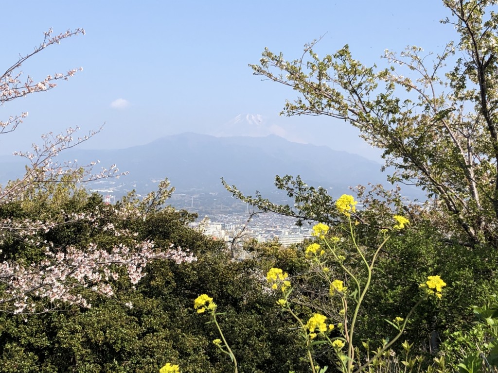 黒瀬登山口には駐車場とトイレがあり、そこから香貫山に向かいます。途中展望台があり霞んではいましたが富士山が望める事が出来ました。展望のない頂上を越えて、桜が満開でとても良い香りのする遊歩道を抜け一般道に出ます。