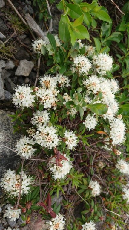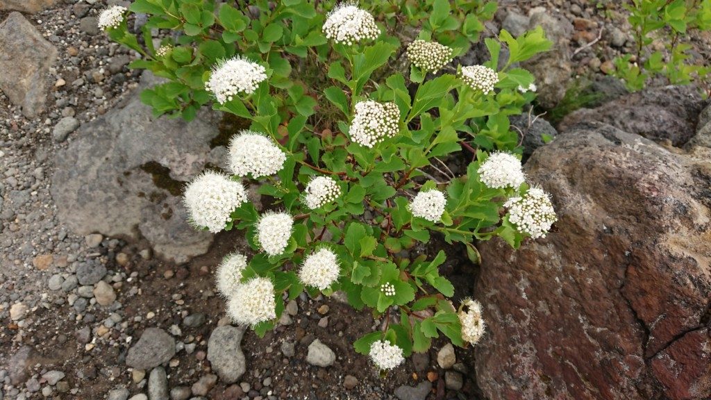 目の前にそびえる十勝岳は白い噴煙を盛んにをあげており 今も24時間監視がなされている 活動レベルは1。噴火口は1962年に形成された62-2火口で登山道はこの火口から1キロの地点を通って行く。風向きによっては火口から噴出する音がゴーッと聞こえるが 硫黄臭などは無く 緩やかな勾配の裾野を1時間ほど歩く。活火山の登山時には常に退路を確認する必要があるが なだらかな地形で遮る物の無い中 どこへでも逃げられるが 身を隠す場所は1ヶ所ある避難小屋のみ。足元の植物はどれも水平で膝より高い植物はない。 ところどころで マルバシモツケとイソツツジが白い花を咲かせていた。