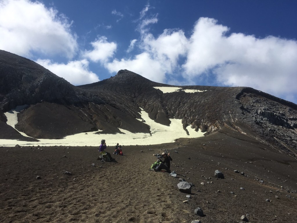 やがて雲ノ平分岐をすぎ 摺鉢火口の横を通る 火口の中は残雪があり池らしき物も見える。十勝岳は北海道の中では比較的雪どけの早い山だそうで 登山道に雪はない。また切り立った崖や危険箇所もなく 全体に登りやすい
