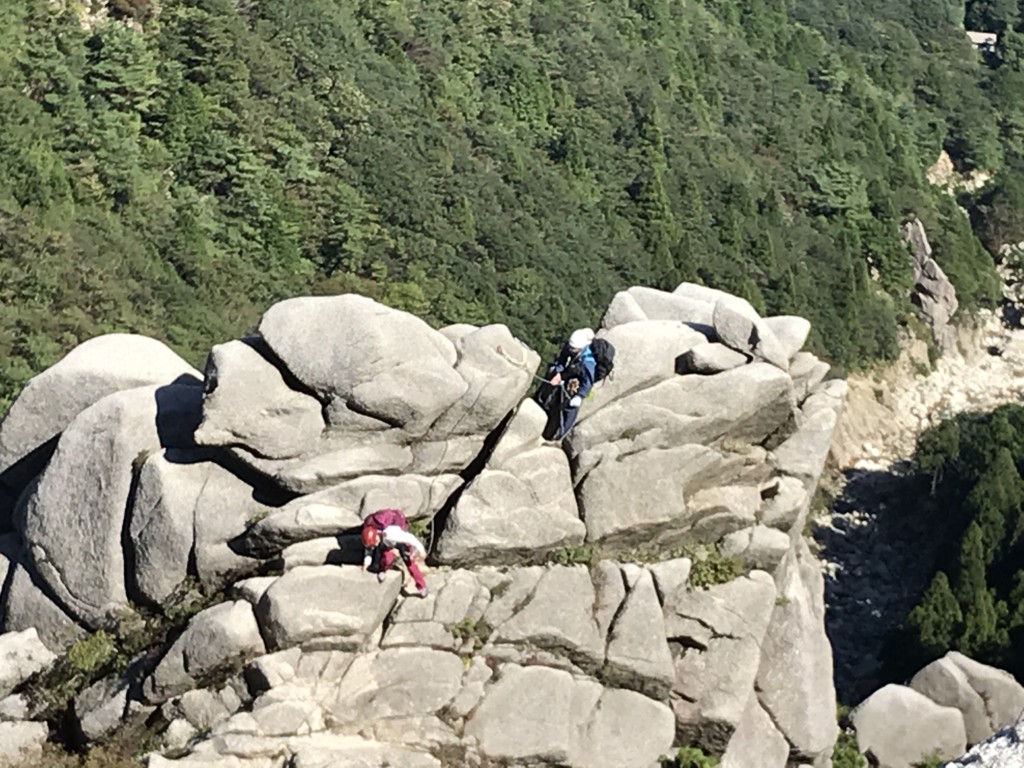 御在所前尾根マルチピッチクライミング 投稿者: フミフミ2019/11/102020/05/07活動報告 P6をクリアしたO田N田ペア 御在所前尾根マルチピッチクライミング御在所2019年10月9日4名 4名2パーティにて御在所前尾根マルチピッチクライミングに行ってきました。 平日ということもあり、晴天にもかかわらず貸し切りの前尾根を合流したり離れたりしつつゆっくり クライミングを楽しんできました。 T田Y田パーティはすべてT田リード。 O田N田パーティは時々N田がリードし、他はO田がリード。 安全第一でトラブルもなく終わりました。