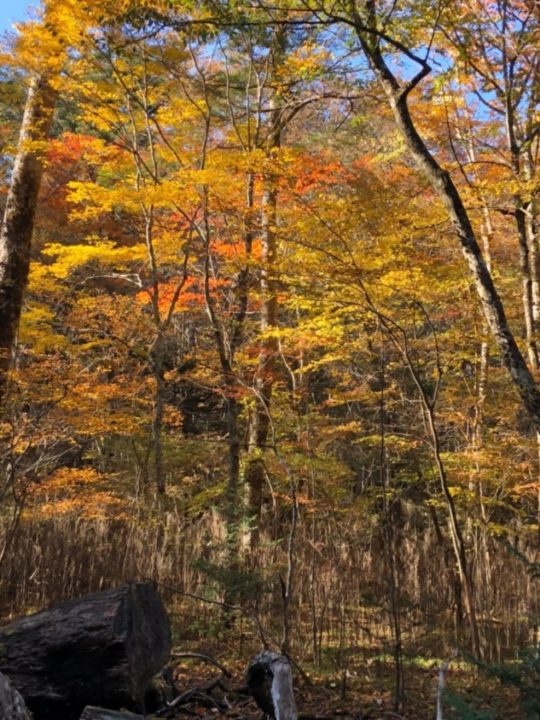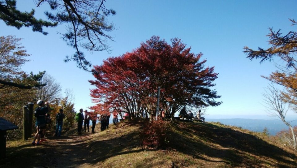 さわやかな秋晴れの中 今年一番の紅葉の下での山行となった。集合地の段戸湖はつり大会が行われており 駐車場はすでに満車、路上駐車の列であった。賑わう段戸湖からスタート。登山道は東海自然歩道も兼ねており なだらかで歩き易い 安心して頭上を見上げながら総勢16名でそぞろ歩く。ところどころ黄色や赤の彩りが美しい。昨日の宴会の様子などを聞きながら 和やかな雰囲気は まさに親睦山行。休憩を2回入れ山頂に到着。春には赤い花を咲かせるドウダンツツジの葉が真っ赤で青空に映える。皆で記念写真をパチリ。奥三河の山並を眼下にベンチで昼食をすませた後は同じ道を下山する。各々のペースでおしゃべりを楽しみながらの帰り道でも 朝とは違う陽に照らされた紅葉を楽しむ事ができた。
