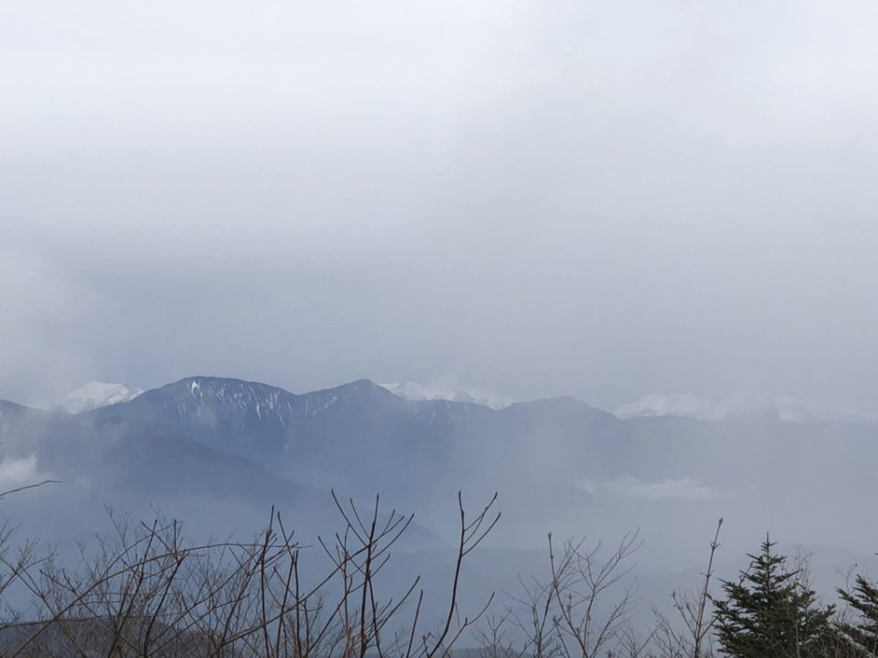 写真をパチパチ撮りながら伊那方面からしか見た事がない南アルプスにも感動の声。3人以外は誰もおらず つい騒ぐ。足取りも軽く天子ヶ岳へ。45分で山頂付近へ…しかし山頂をスルー。わずかに戻ると天子ヶ岳の小さい看板。長者ヶ岳と差がありすぎる。登山道もこちらは手つかず。長者ヶ岳は山梨県 天子ヶ岳は静岡県の差?。ここで昼食。寒い。カップ麺で温まる。早々に出発後5分ほどで富士見台に到着。名前の通り富士見。この付近は白ヤシオが5月に咲くと案内あり。