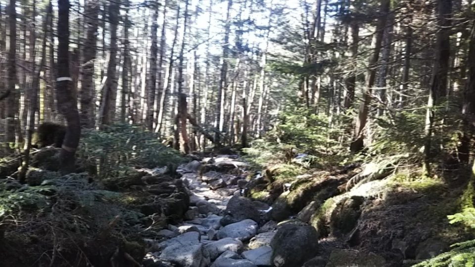 駐車場から5分ほど先にある奥蓼科登山口から歩き出す。黒百合ヒュッテまでは2時間半の予定。 みごと夏道。雪訓じゃなくて背荷訓だわ、などと話しながら進む。 小屋のブログには「唐沢鉱泉分岐から天狗まで積雪5cm」とあったが、分岐からも時々凍ってはいるものの積雪はほぼないに等しい。