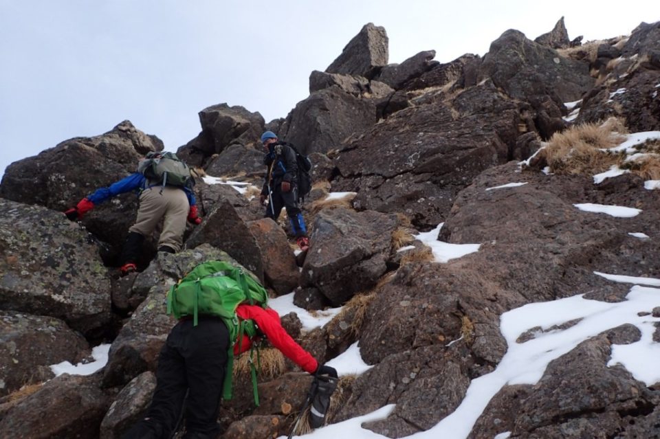 6:00起床、8:20空荷で天狗へ向かう。 冬装備の確認目的もあり3/4人はアイゼンを装着。ピッケルとストック各々の装備で上がった。