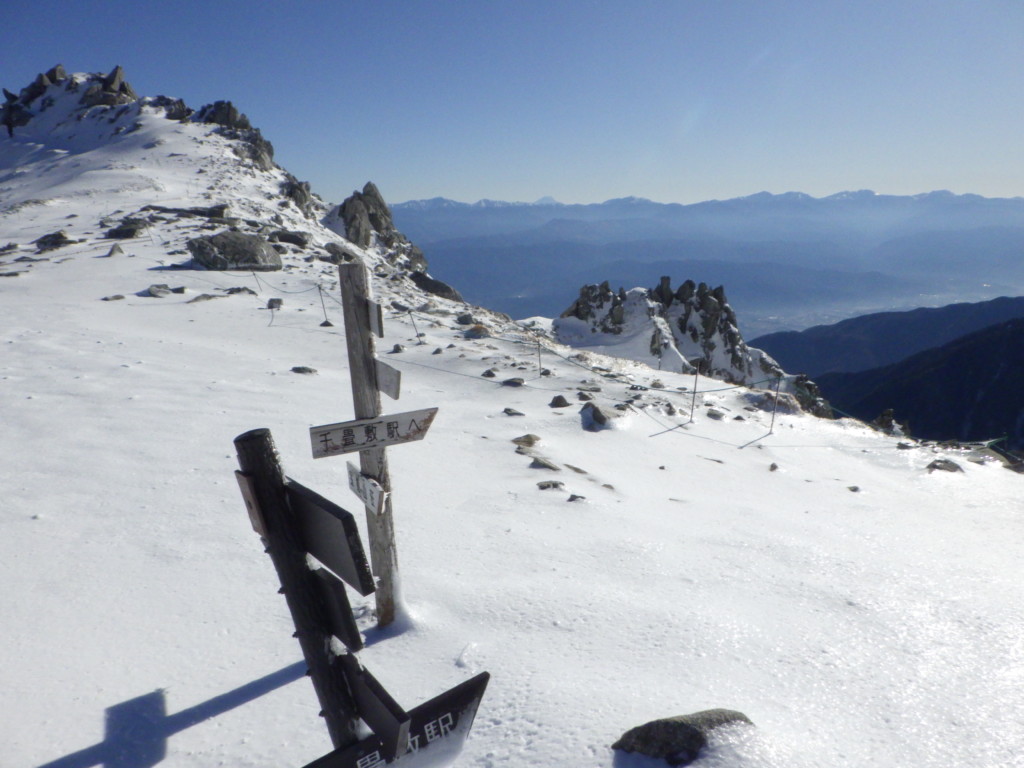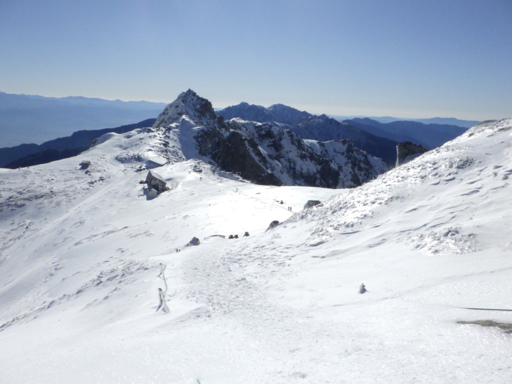 快晴で風も無く、最高の登山日和でした。 2年前の雪訓では気を付けて歩いた乗越浄土の手前も階段が出ている状態で、雪はとても少ない状態でした。木曽駒の頂上からは富士山、北・南アルプスなど360°の素晴らしい展望が望めました。計画より早く進んだので、宝剣岳にチャレンジする事にしました。ザックを置いて尾根沿いのルートから頂上を目指しました。登りは岩を掴んで登る事が出来、登りやすかったです。下りの急な所は横向きや後ろ向きでピッケルやアイゼンの爪の使い方を教えてもらいながら慎重に降りました。 素晴らしい景色の中、宝剣岳にも登る事が出来、大満足の山行でした。