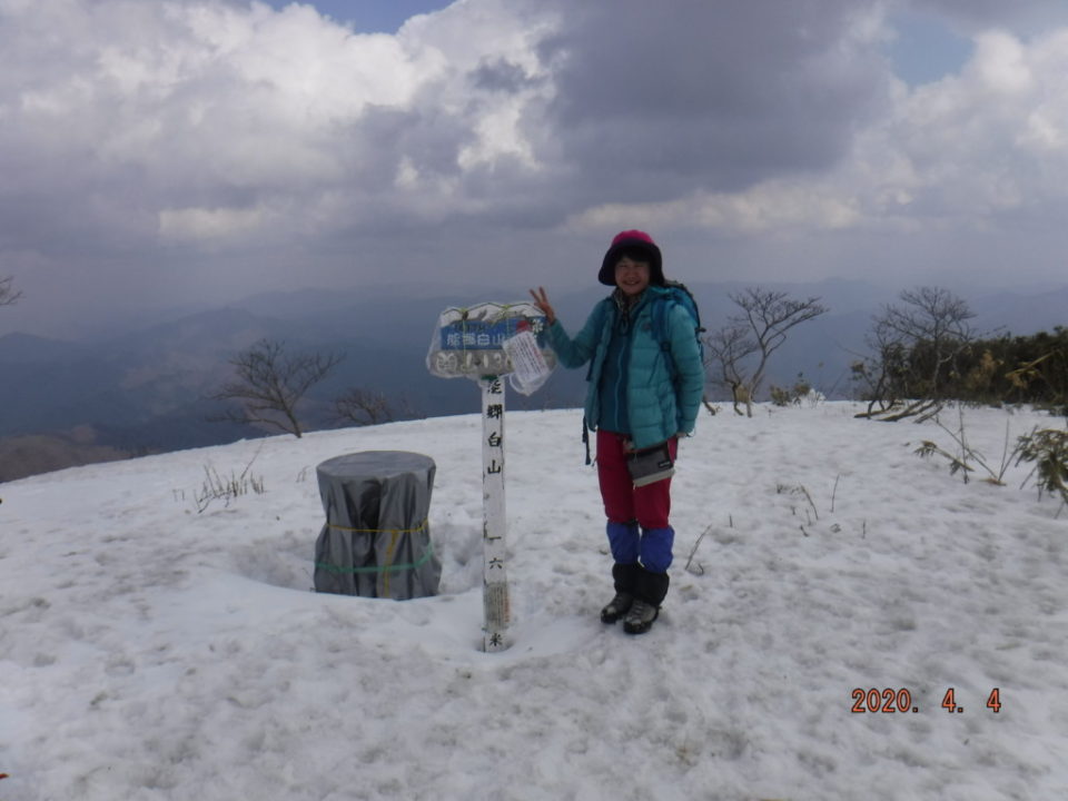 安城・碧信今村支店(3:30)===能郷林道ゲート(6:10)(6:30)---能郷白山登山口(7:35)----尾根道分岐(9:05)---前山(10:40)---能郷白山山頂1617m(11:45)(12:50)---前山(14:10)---登山口(16:05)---林道ゲート(17:10)===根尾淡墨桜(17:50)===安城・碧信今村支店着(21:10)