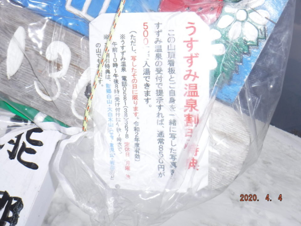 山頂標識の温泉割引券(薄墨温泉)