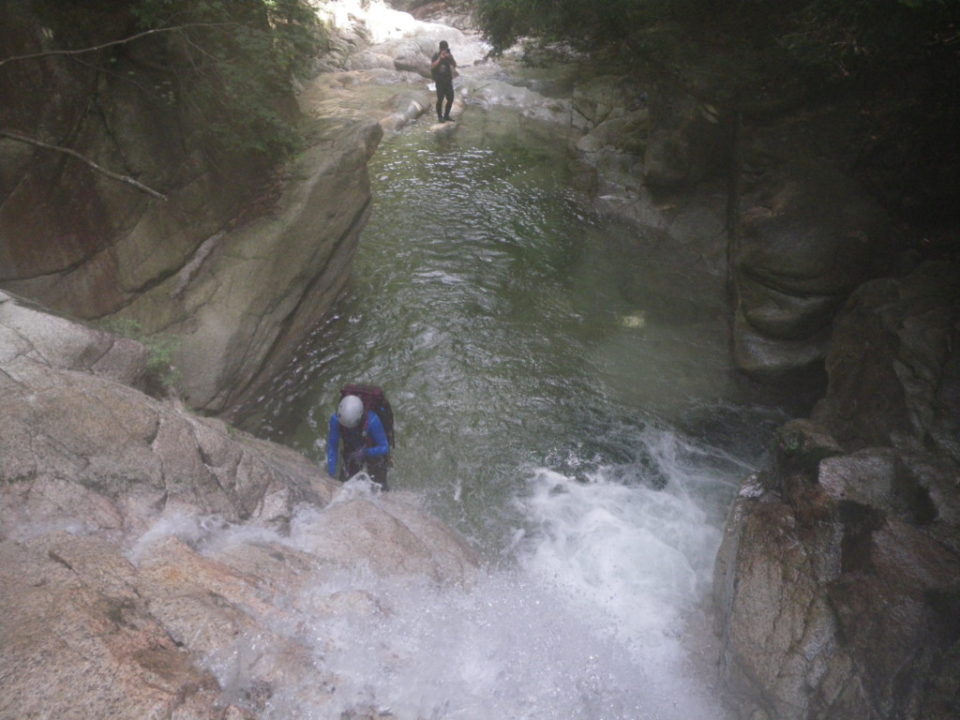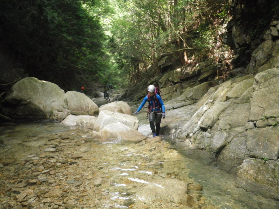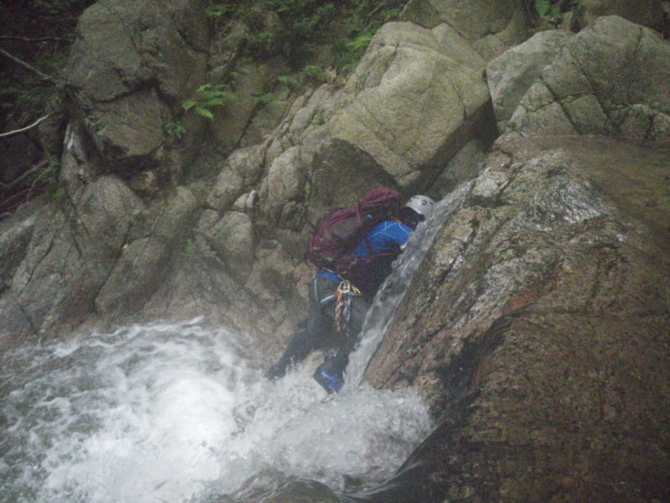 雨が多かったので、もっと水が多いかと予想しましたが、行ってみればいつもと同じくらいの水量。冷たさもそれほどではなく、釜や淵のたびに泳ぎ、わざわざ流れの下からシャワーで登ったり、たっぷりと水と戯れてきました。