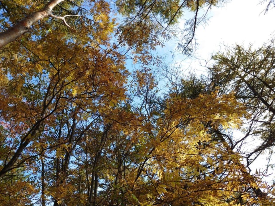 当初の予定よりも若干早く林道のゲートに到着。まずは林道歩き。登山口からは急坂が続いたが、ゆっくりと歩を進める。4合目を超えると少しずつ眺望が開け、冠雪したての南アルプスが目に飛び込んできた。皆テンションがあがり、左から、甲斐駒、仙丈、北岳…ん?塩見?と地図を広げて確認作業。高度が少しずつ上がるにつれ、南アルプスの端から端まで見えるように。眼下には雲海、遠方には冠雪の南アルプス。近くに目をやると紅葉が始まった木々とその景色に癒される。途中、中央アルプスや八ヶ岳もみえてくる。御嶽を熱望するS田さんは、御嶽山が姿を現してくれないことがショックの模様。「あれが御嶽?」「方向が違う!」のやり取りが続く。I村さんはいつものトークが終始炸裂。御嶽山を待ちわびていたS田さんに突如御嶽山の眺望が現れる。S田さん以外のメンバーも思わず「おおっ」と。御嶽だけではなく隣には乗鞍、北アルプスの姿も。