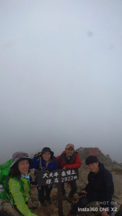 翌朝は3時に起きて、準備をし、山荘からのピストンで4時半に大天井岳へ向けて出発しました。昨日は綺麗に見えていた稜線がガスって何も見えなかったので、またリベンジしたいです。大天井岳には7時ごろ到着しましたが、山頂でも360°ガスで何も見えませんでした。帰りは予定より早く歩けたため、2時ごろには下山できました。