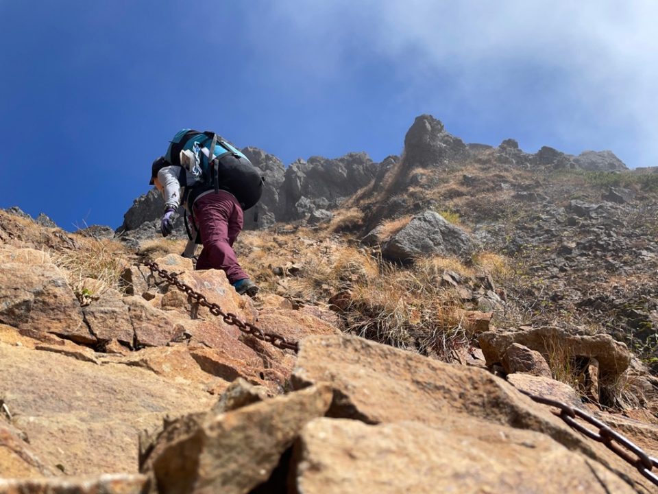 権現岳を越えると岩場が増えて長い梯子や鎖場がありましたが、キレット小屋から真教寺分岐までは鎖は少なく、崩れやすい岩もあったので注意が必要です。赤岳直下から横岳辺りは大きな岩で安定していて、各所に鎖があるので3点支持であれば問題なく歩けると思います。