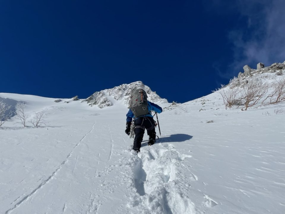 その後ノートレースの極楽平に向かいます。「どこを登っていきますか?」その問いに私は尾根を指しました。多分間違っては無いでしょうが、それはバリエーションルートのサギダル尾根でしたwその尾根より左側で、谷を緩くトラバースして、一番緩そうな雪庇を乗り越える。そのルーファイを教えてもらい進みます。モフモフの新雪のラッセルは大変で、T村さんの後ろでラッセルの仕方を見て学ばせて頂きました。雪庇の乗り越えは達成感があり楽しかったです。