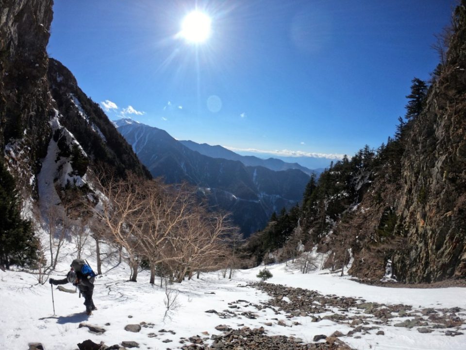 戸台駐車場で田代さんと合流し、戸台川沿いに歩く。渡渉は2回で、ストックがあると安全にクリアできる。2時間ほど歩くと角兵衛沢出会、そこから角兵衛沢を詰める。前半は雪はほとんどなし。ところどころある赤テープを探しながら歩く。中盤くらいから雪が増えてきて、雪とガレの混ざった登りとなり、想像するにた易いと思うがストレスと疲れが蓄積される。後半になってくるとガレはなくなるが、モナカ雪となる。疲れとストレスの蓄積度は変わらない。しばらくすると岩小屋下のテント場に到着する。とてもよいところと聞いていたが、もはやテントサイトと言っていいくらいの好立地… でもまだ時間あるからと、角兵衛沢のコルの手前のテント場を目指したところ、ここからの登りはキツかった。そして、テント場もキツかった(狭かった)。