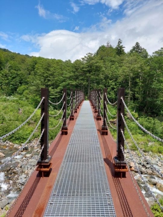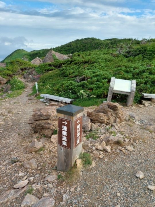 - 8月14日 朝日小屋(0445)—朝日岳(0550-0620)—吹上のコル(0710)—花園三角点(0950-1020)—兵馬の平(1320)—蓮華温泉キャンプ場(1430)—蓮華温泉着(1450)入浴後==西尾着(2200)