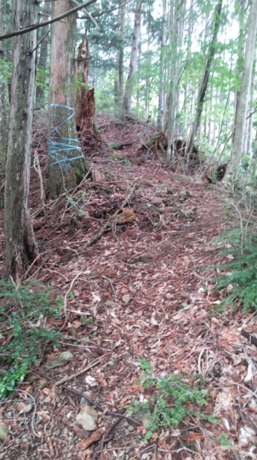 デポ用の水と当日の飲料水で6L以上の水が身体に堪える。ずっと樹林帯の登りが続くが、汗が流れ落ちてくる。風がなく、湿度も高い。辛いので出発して40分で小休止する。疎林の中の踏み跡があるだけの道が延々と続く。目印はたくさんあった。虫が多かったが、心配していたヒルはいなかった。