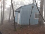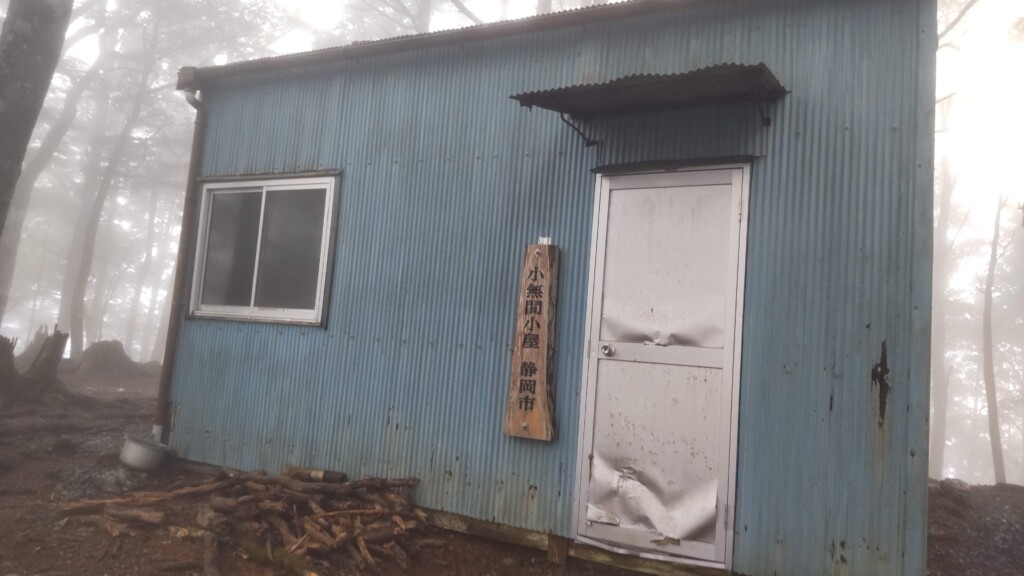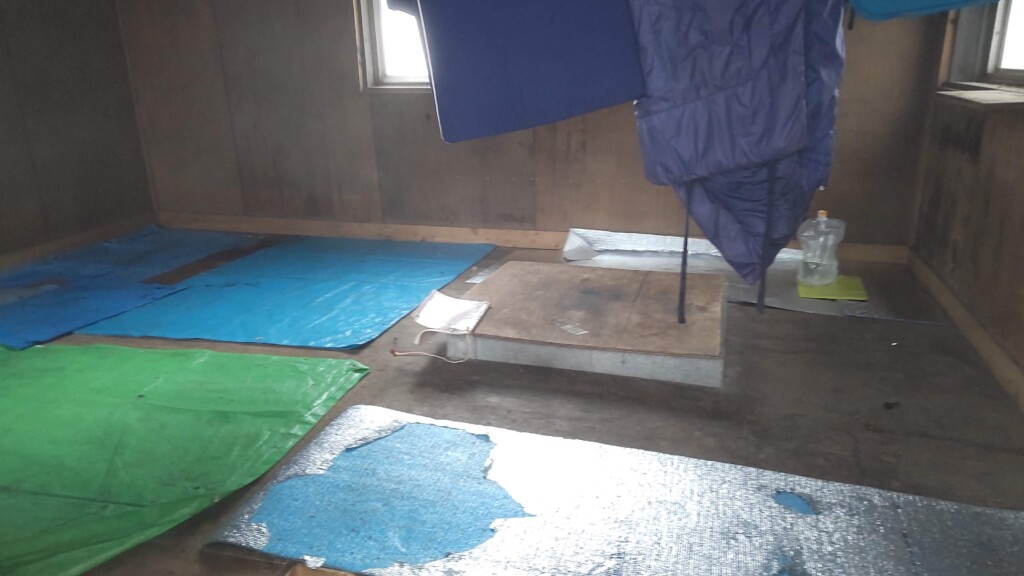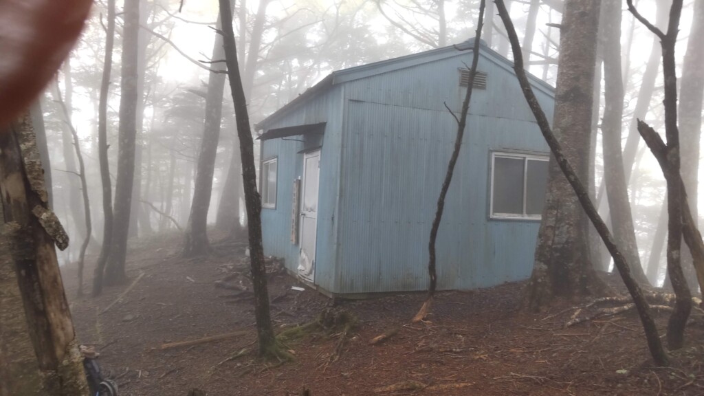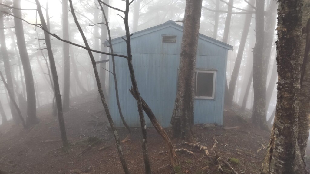 小屋まで1時間の地点から斜面がきつくなる。なんとか小屋に到着。土間が少しあるだけのシンプルな小屋。詰めれば10人くらい寝られそう。床にはブルーシートが敷き詰めてあった。カビがひどいせいだろう。