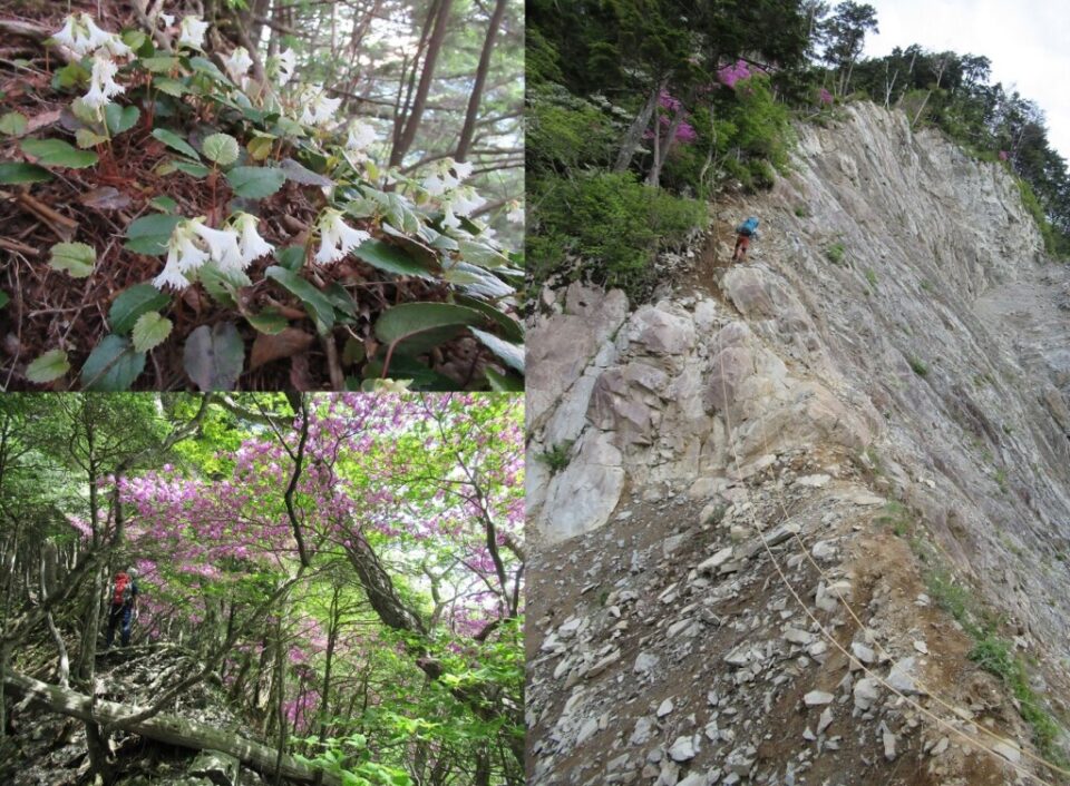行程が長いので日が昇る前に出発。小無間山までは鋸歯と呼ばれるP1~P3までの急峻なアップダウンの連続。日が昇ると、稜線に無数のイワカガミがあることに気づく。白いイワカガミが多いがピンクのも有り、長い稜線でも途切れることが無い。また、シロヤシオやミツバツツジも満開で、最高の稜線に感激!!P1を超えると核心部の崩壊地に出る。高度感はそれ程ではないが、浮石が多く滑りそうな箇所が多いので慎重にロープを掴んで登ると小無間山に出る。