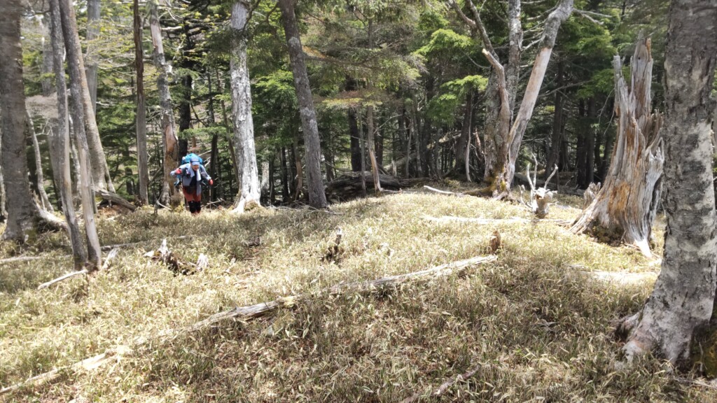 樹林帯を抜け本来のルートに戻ると、踏み跡がある。アップダウン控え目な歩きやすく、笹や新緑が美しい道が続く。熱くもなく寒くもなく快適。ずっとこういう道が続けばいいのに……。