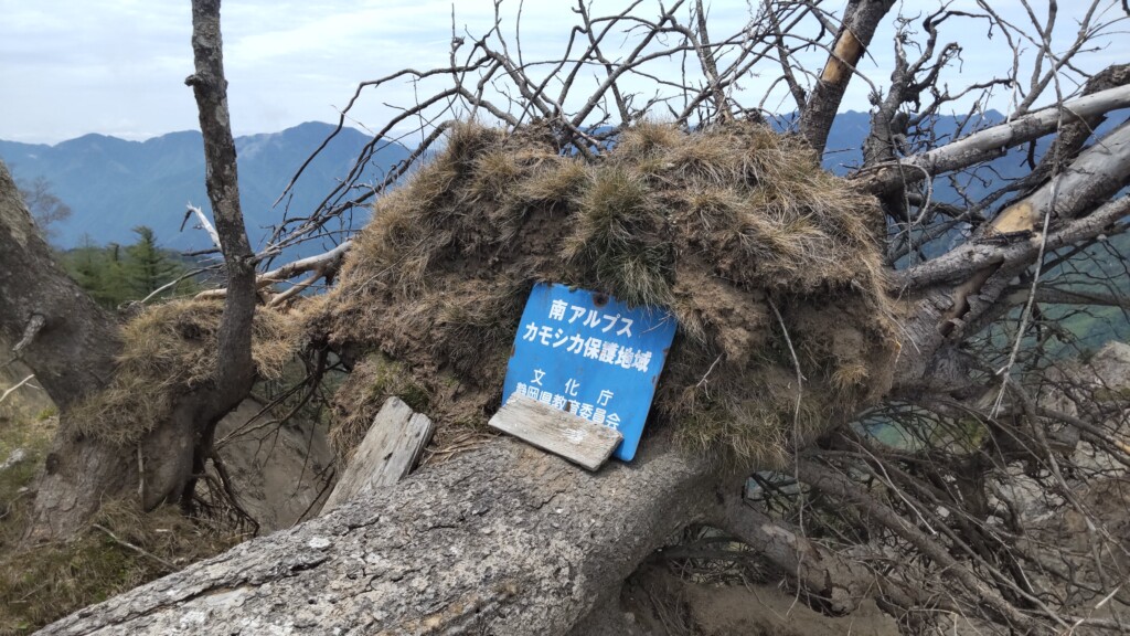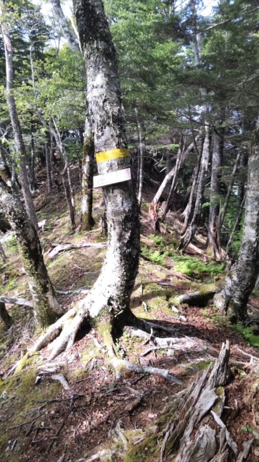 三方嶺を過ぎ、稜線を乗り換える箇所に来ると、また踏み跡が錯綜してきて、いつのまにか消えていた。赤布も見つからない。スマホを見つつ向きを修正、踏み跡を探す。ちょっとした踏み跡を見つけてそれを辿ると、どんどんと本来のルートからずれてしまった。獣道と踏み跡の区別がつかない。鹿のフンがいたる所に落ちているし、さっきはカモシカと目が合ったし、その直前にはシカが前を横切った。