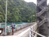 また林道に出るも、まだ千頭ダムまで山道の下りが続く。固定ロープなどもあったが、こちらも同程度の悪路。やっとダム上の林道に出て一安心。