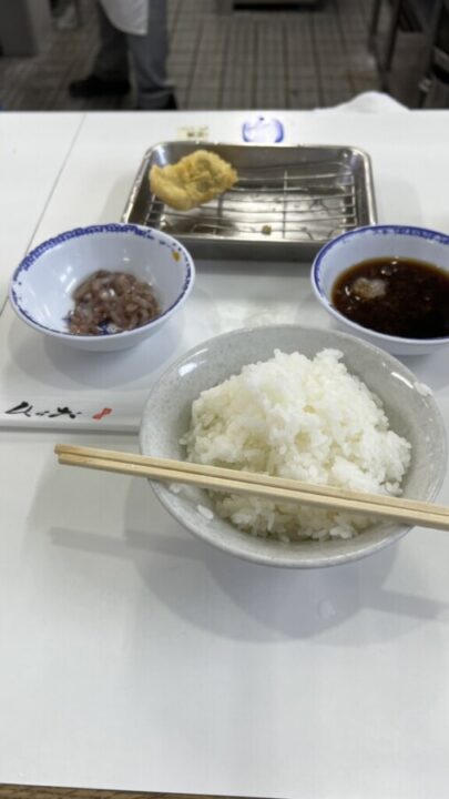 締めご飯はCLお気に入りの福岡空港前「ひらお」で揚げたて天ぷらとイカの塩辛(おかわり自由)で満腹。