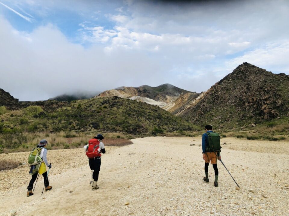 5月29日 法華院温泉でお湯、水、お茶は補給放題。下山地の牧の戸峠から長者原登山口までの移動に11時2分のバスに乗るため、朝食はお弁当にしてもらい5時半出発。強風の北千里ヶ浜を通り、右手に硫黄岳を眺めつつ久住分れへ向かう。