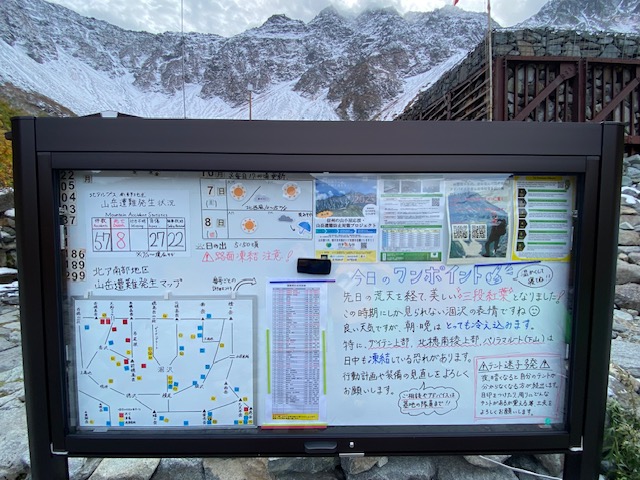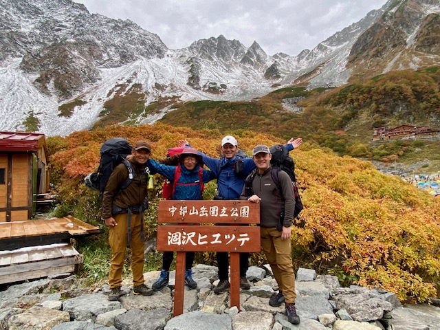 モルゲンロートを狙って5時起床。温度計は1℃を指す冷えこんだ朝を迎えたが、なんとも気持ちが良い。大勢の登山者がカメラを構えモルゲンロートを待ったが、残念ながら雲がかかり見ることは出来なかった。しかし、明るくなって見えてくる涸沢カールの三段紅葉は圧巻!!皆で朝食をとりながら見るその景色は最高でした。涸沢から上高地までは、昨日と同様断続的に登山者が列をなすことがあったが、気になるほどではなかった。途中、徳澤のカレーを食べに行こうと言うことになったが、さすがにここは大行列で断念。明神で休憩を取り、上高地バスターミナルに到着すると、バス待ちの長い列。タクシーを選び、乗り場に行くと待機台数は数台であったが、回転が速いためすぐに乗車することができた。(上述のタクシー情報は、さわんどから来たこの運転手さんからの情報)。帰りはあかんだな駐車場からすぐの「ひらゆの森」に立ち寄る。駐車場はほぼ満車であったが、浴場は広くゆっくり温泉を楽しむことができた。宿泊エリアに有るレストランで食事も済ませ、帰路に着く。20時無事豊田到着し解散。