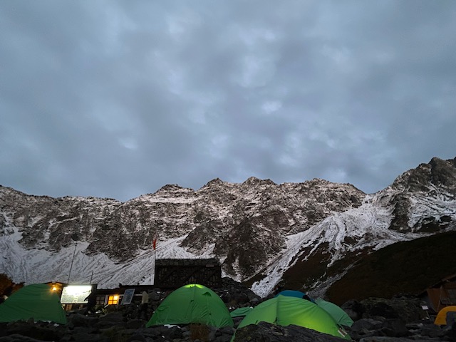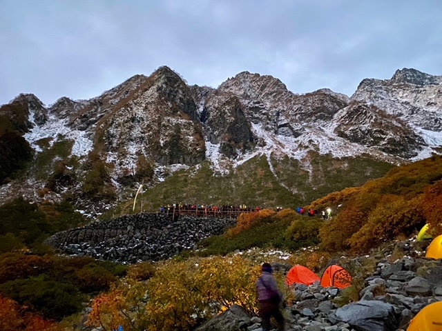 計画から1時間遅れで上高地バスターミナルに到着。河童橋では青空と冠雪した白い穂高連峰の景色に感動!上高地から涸沢までは計画通りのペースで進み、1時間遅れの13時に到着。すでに多くのテントが張られていたが、なんとか4人用のスペースを確保。テントを張り終え、落ち着いたところで山岳救助隊基地前の掲示板を見に行くと、ザイテン上部は日中も凍結しているとのこと。残念であるが、この情報をもって翌日の奥穂登頂は中止と決定。と決まると、今度はアルコールが足りなくなるわけだが、そこは涸沢ヒュッテ、ビールの自販機完備!食当A立さんが用意してくれた焼き物と鍋をいただきながら、アルコールも進み、楽しい夜となりました。