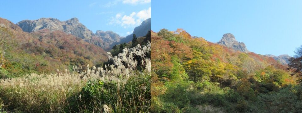 今回は秘湯探検家の渡辺裕美さんが紹介したことで一躍全国的に有名になった梶山元湯ツアーに参加しました。11月なのに夏日の晴れ予想、期待して出発!途中、早朝の白馬村を通ると無茶苦茶寒い。本当に夏日になるのかと疑問を持ちながら積雪した白馬三山を望みながらドライブを楽しむ。少し暖かくなってきたなと感じる頃、糸魚川市の根知地区公民館に到着、ここが集合場所。梶山元湯ツアーは根知未来会議という地元の方々が村おこしの為に企画されているツアーで、目的地の梶山元湯は私有地でツアー以外の立ち入りは禁止。1人から予約可能でガイド料は6,000円だが、2人で参加すれば3,500円/人、5人で2,000円/人と参加人数が多くなるにつれ安くなるシステム。1組/日なので他の知らない人と組み合わせられることはなく安心。今日は今シーズン最終日ということで温泉を閉める(掃除する)ため、ガイドと地元の方で4名、雨飾山荘の女将さん、私の6名でのツアーとなった。公民館から車で約15分で入山口に到着。いきなり頸城駒ヶ岳の紅葉が素晴らしい!