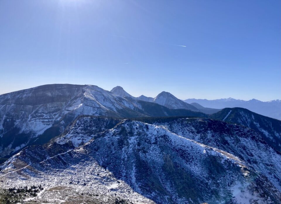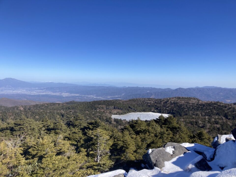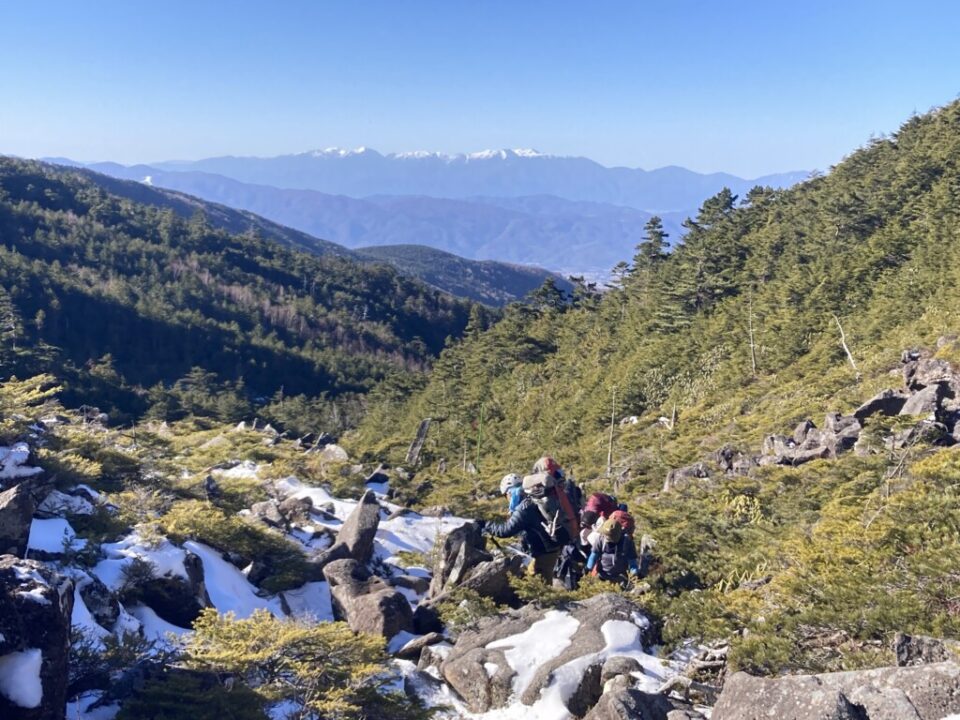 休憩を挟みながら時間が押してきてはいるものの、賽の河原に出たころには青空と遠くに見える中央アルプスと南アルプスの山々。開けた場所でも風はなく陽が暖かいまさに山日和なコンディション。