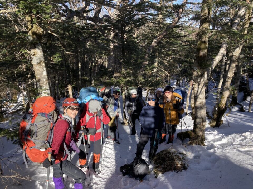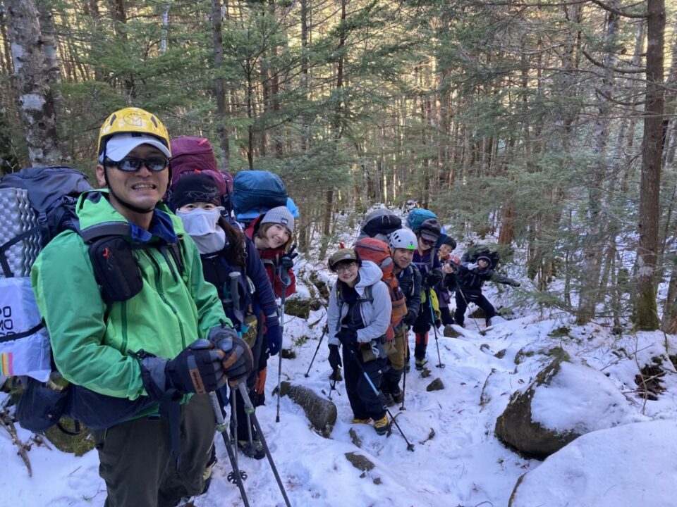着雪はあれど、少ない雪のため全員ツボで。私はこの機会のためにCLよりお借りした60Lザック、十分でかいと思いながらも、メンバー全員がそれ以上の大きいザックを背負い、10人列を成して歩く。その隊列の一部で歩けるのは光栄だなぁと思いながら雪のついた苔苔の森を上り詰めること2時間強。