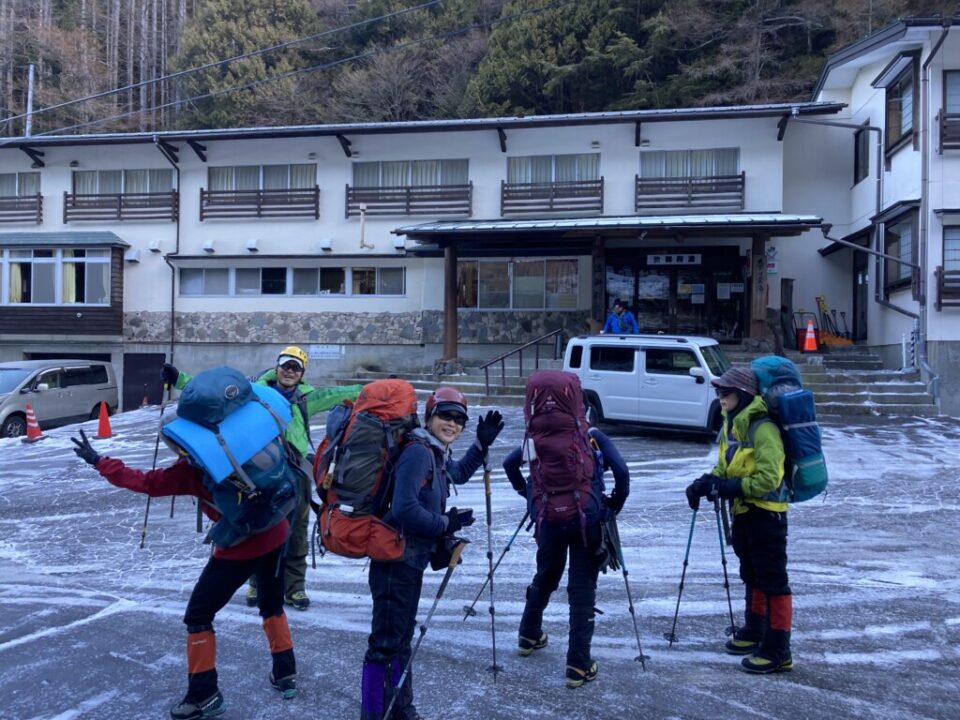 【渋の湯7:30集合】最初の難関は登り始め前にやってきた。駒ヶ根SAで合流し1泊2日組10名3台で雪もない林道を通って難なく渋の湯に到着するも早々、渋の湯・有名女将に叱られる。3台しっかり整列させられ、凍結アスファルトをつっかけサンダルで軽快に走る女将に誘導され無事🅿︎。無事、登山開始。