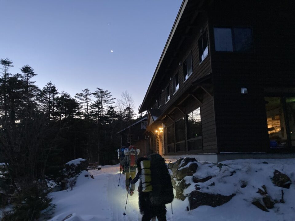 「みんなで雪山」のハイライト、雪山テント泊。大きなテント2張で食当さんが準備してくれた美味しい食事、持ち寄ったお酒と弾む山談義etcetc….雪山テント泊のイロハもたくさん学びました。ロープウェイ運休中ということもあり、テント場は私達の2張から離れた場所にソロの1張と、静かな白駒池の畔で賑やかな夜を過ごすことができました。