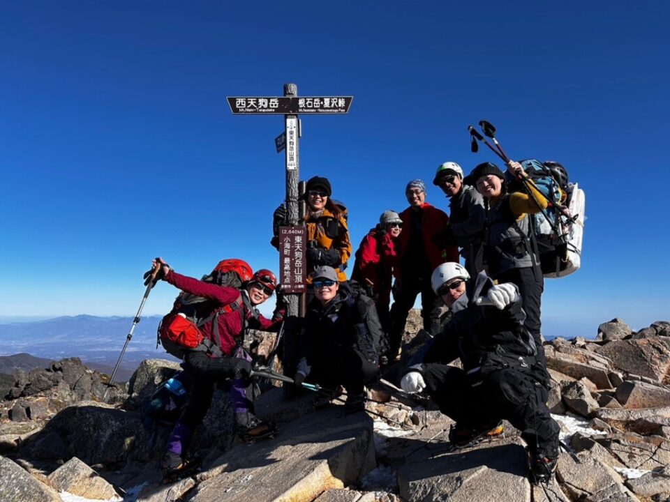 天狗岳までの積雪は少なく雪と岩のミックス。ただ、青空で風もなく暖かい中歩けるため非常に良いコンディション。泊まり班5名+10日日帰り班3名の計8名、10:15東天狗岳登頂、10:40西天狗岳登頂!