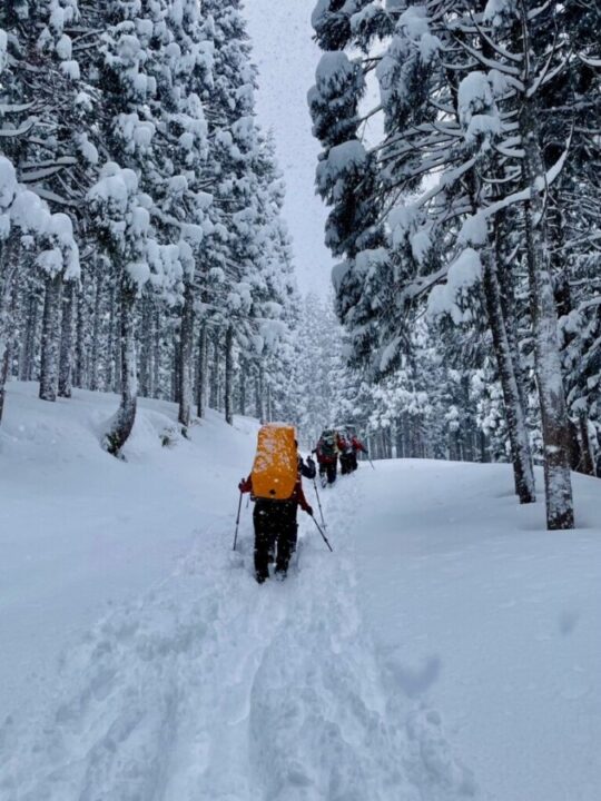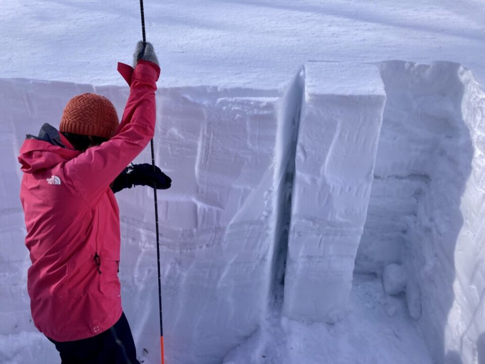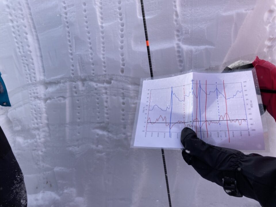 滑落停止訓練は雪がフカフカのせいか全然滑らず、ハードシェルの効果を存分に実感しました。次回は滑りそうなアウターを着て練習してみたいです。弱層テストのための層の観察、雪の結晶の観察、ここ最近の気温と天候や着雪情報を組み合わせて雪の層を見ていると本当に雪の層に情報がたくさん表れていて、初めてこんなにも雪を観察し、とても勉強になりました。