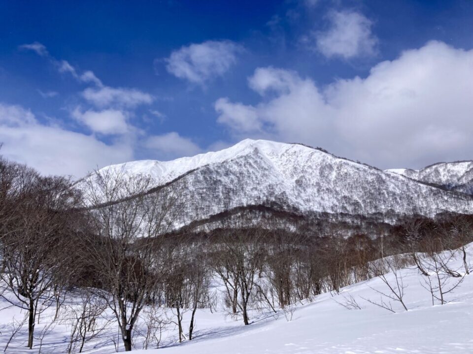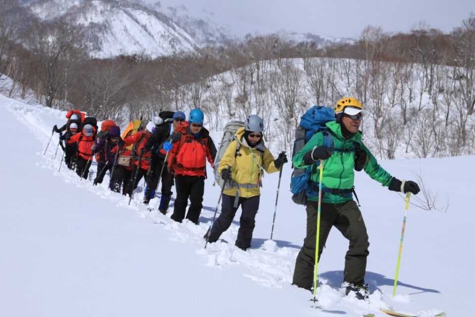 訓練が終わる頃には青空も見えて、野伏ヶ岳の山頂を拝むこともできました。テントを撤収し、歩き隊とスキー隊に分かれて下山です。