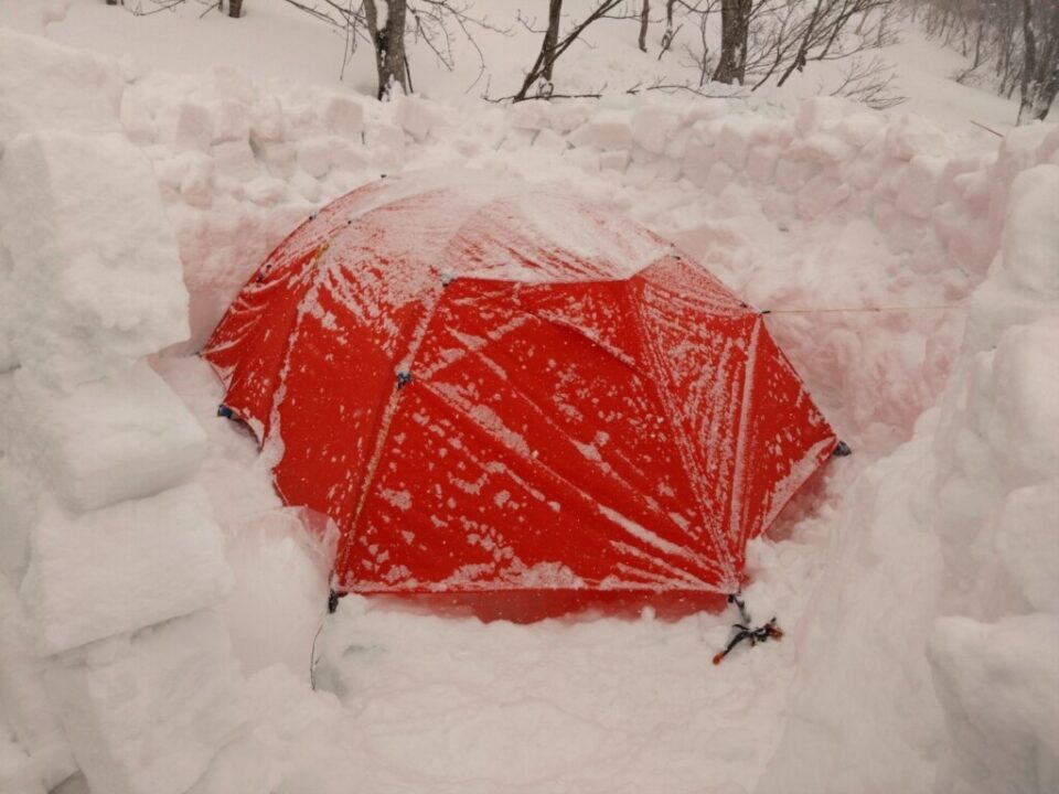 和田山牧場跡を宿泊地として、風向きや、雪崩れリスクの少ないエリアに6Pテント2張、ソロテント、ツェルト、トイレ2ヶ所の整地を行い、積雪後のため柔らかい雪をとにかく掘って、硬い部分に来たらスノーソーで雪を切り出し塀を作りました。