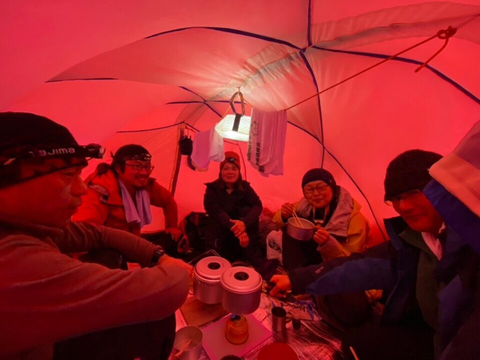 1日目の雪訓を終えて、雪からの水作りから食当さんの美味しい食事で乾杯。山のこと、山じゃないことを語らい、外は雪で寒いのにテントの中は暖かくて、いつもとても楽しい時間です。気付けばぐっすり眠り、朝。前回の八ヶ岳でもそうでしたが、雪なのにこのペラペラのテントの中でなぜに全然寒くないのか。不思議でしょうがない。朝ごはんもしっかり食べて、訓練2日目です。