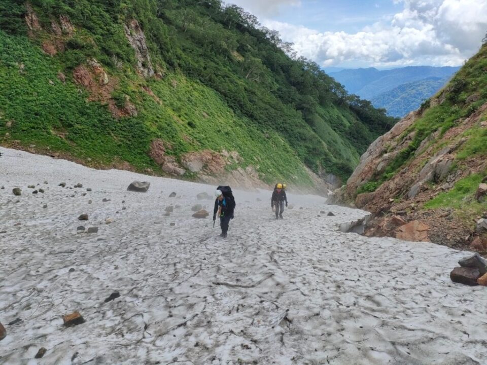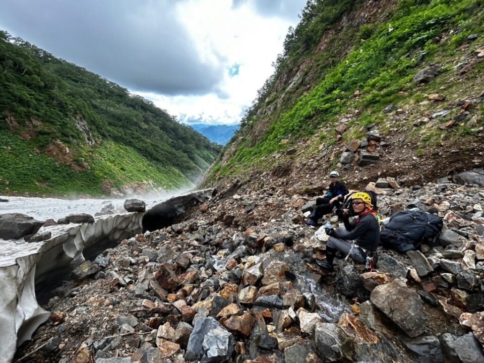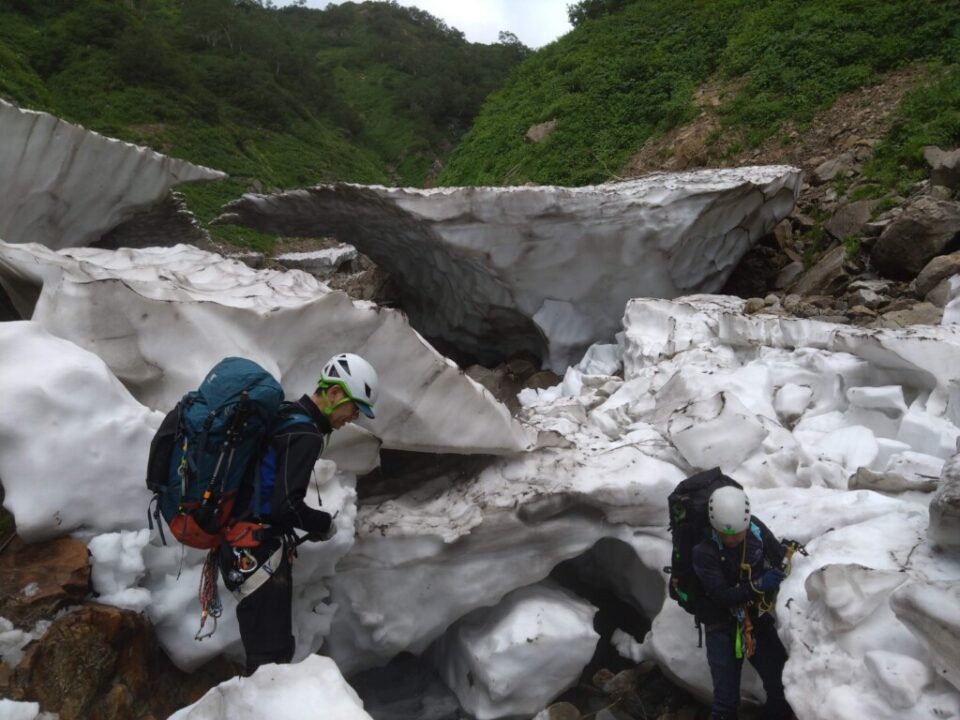 崩れたばかりの雪渓に這い上がり氷の割れ目や穴に足を落とさないように気を付けて歩いたり
