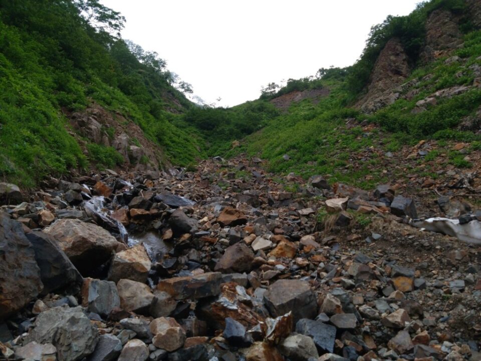 最後の難所の斜面はガレガレでバイルが効かない、足場も溝の浅い沢靴でズルズル滑る最悪の斜面で、まだらに生えている雑草を必死に掴んで泣きながら登る(写真を撮る余裕はない)