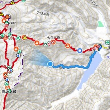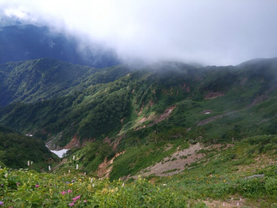 7月27日A立宅(7月26日21:00) ===豊田東IC ===東海環状高速道路 ===荘川IC ===大白川駐車場1235m(00:00) ~<仮眠>出発(06: 00) — 地獄谷入谷(06:40) —雪渓(8:15)ー稜線2190m(11:20) — 南竜山荘テント場2080m(12:40) <テント泊>