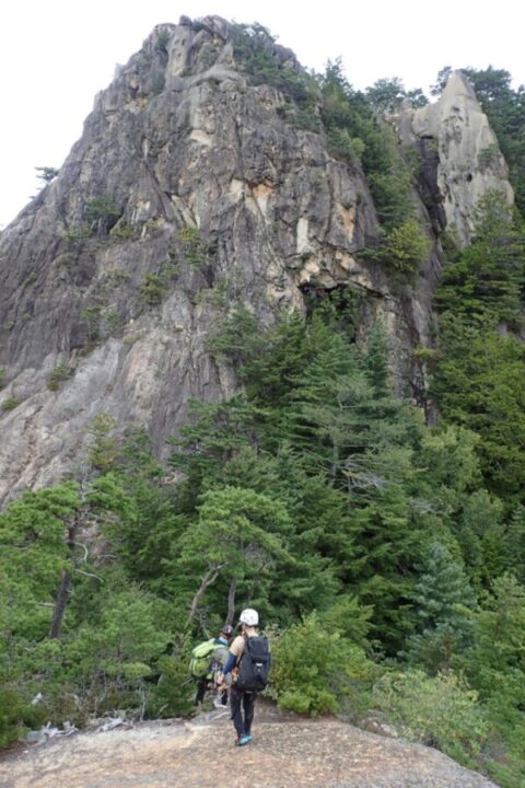 当日、睡眠時間は4時間程度であったが、早出で廻り目平を目指す。キャンプ場に近づくにつれ、今回目指す屋根岩の尾根がドカンと目の前に現れる。気持ちが高まる。連休初日であったが、車は意外に少なく、すんなりと駐車することができた。私自身、小川山は約20年振りで、学生の時に前所属していた山岳会の方によく連れて行ってもらったが、そのときと変わらず賑わっていた。準備をして7時過ぎには出発。まずは、屋根岩1峰を目指す。トポどおり進むも、フリークライミングの聖地である小川山は踏み後が多く、どのトレースが正しいか分からない。ルートファイニング(以後ルーファイ)が試される。狭いルンゼを歩いて進むと1峰の頂上らしき岩峰に出た。頂上は狭そうで、懸垂下降できるようなアンカーがない可能性もあったので、登頂は割愛し、木を支点にして、ロープをつないで30mの懸垂。ブッシュ混じりで、ロープが引っ掛からないことを願って引くと、何とか回収できた。ロープが重く、歩くよりも大変な作業であった。