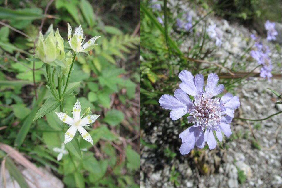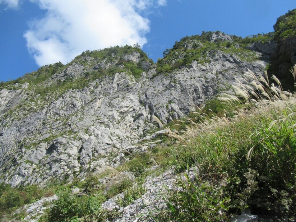 大岩壁を巻きながらサカサ沢の横を進む。樹林を直ぐ抜けてしまい、秋とは思えない日差しでとても暑い。更に暑い夏が続いたせいか、登山道の所々に花が咲いており、サラシナショウマ、ウメバチソウ、アケボノソウに久しぶりにマツムシソウにまで出会うことができ楽しませてくれる。