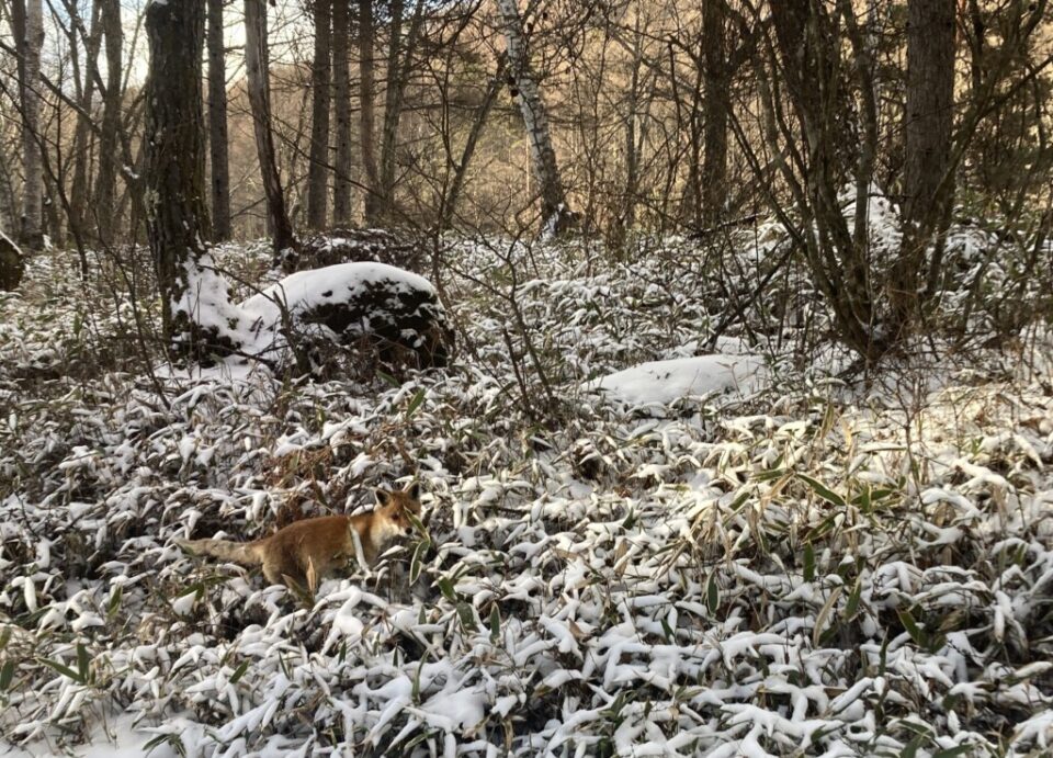 同行の先輩方もヒュッテ前で会った泊り部隊もみんなつぼ足でサクサク歩いていて…もっと雪歩きに慣れてサクサク歩けるようになりたいなと感じました。加えて、まだ雪に慣れてないからこそ、アイゼンに加えてチェンスパもちゃんと持っていけばよかったと思いました。下山後、車から可愛いキツネと鹿の群れに見送られて帰路につきました。
