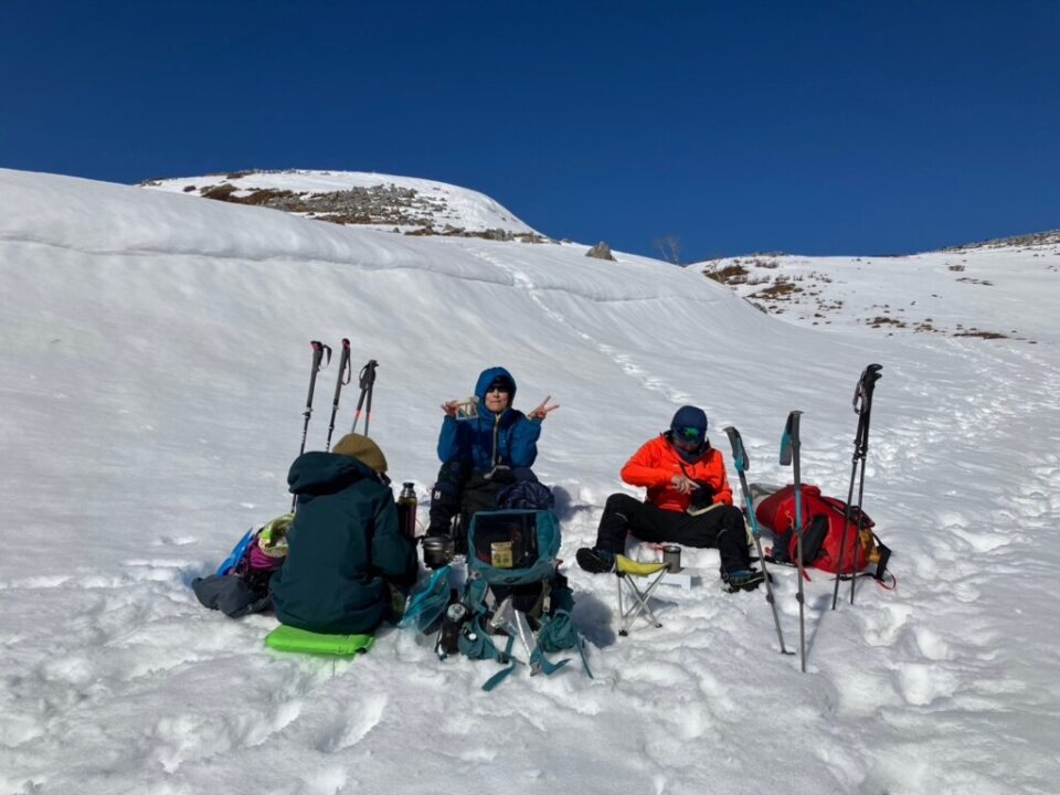 そのウキウキにつられて(?)いつのまにかピークを通りすぎてしまい戻るハプニングあり。踏み抜き後に気を付けつつも膝上まで何度も踏み抜き、時折体が揺られるくらいの風も体験(体感13~15くらい)。風のない場所を見つけ一面の雪を見ながらコーヒーブレイク。雪面にバタ!っと倒れて人型を作るのに初チャレンジしたものの雪が固くてみぞおちに衝撃。色々な経験と青と白の世界のスノーハイクを楽しめました。